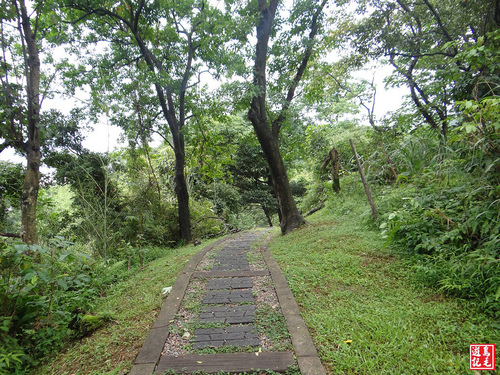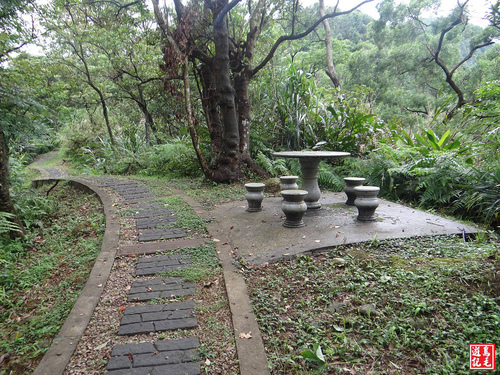 步道隨著山稜蜿蜒起伏,綠意盎然,樹上鳥叫蟬鳴,步道沿途也設有石桌椅可供休息。