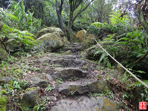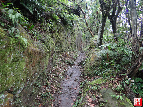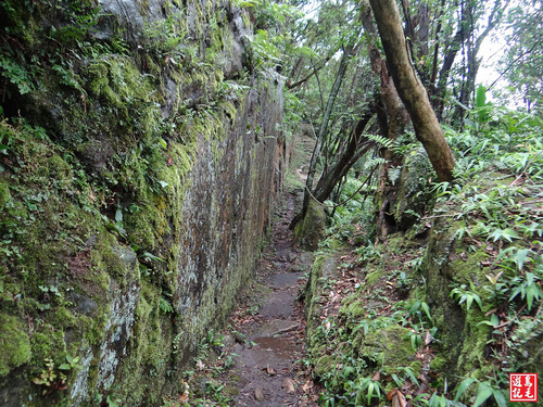 接近山頂是較為原始的步道,鑿石為階,雨後稍微溼滑,小心爬上,通過如刀削的陡峭大岩壁,路窄不容二人併肩而行,即將到達山頂。