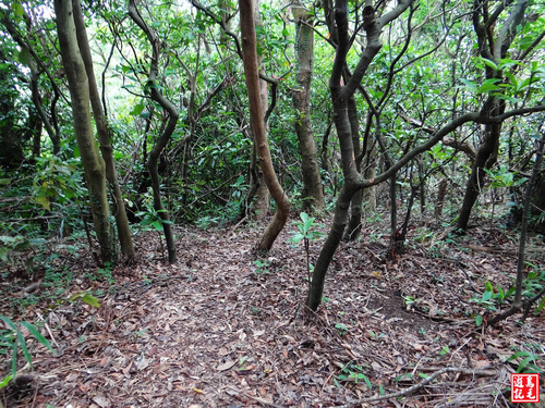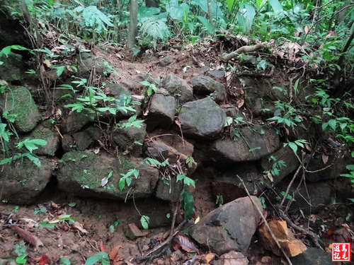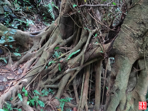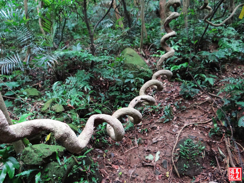 隨即進入雜樹林間,見有石塊堆砌駁坎,似早期聚落遺跡,如麻花般螺旋狀的樹藤、八爪魚般盤根錯節的裸露樹根,皆植物原始之美趣!