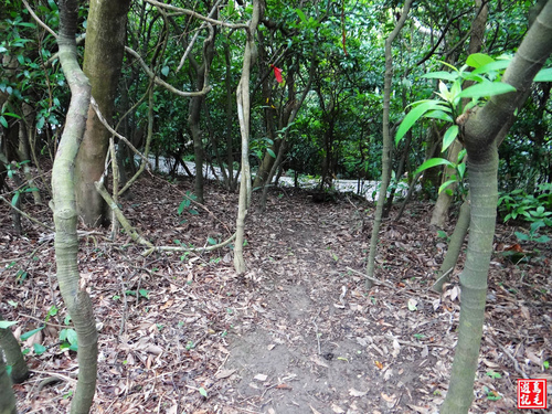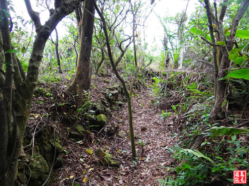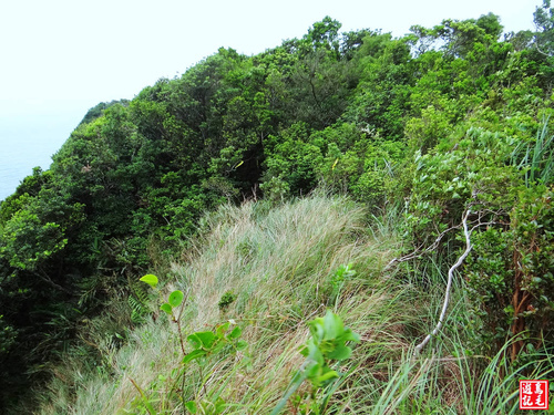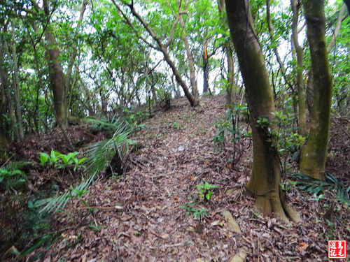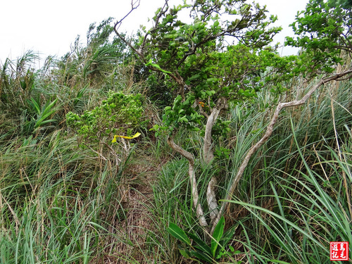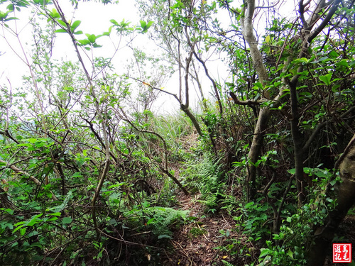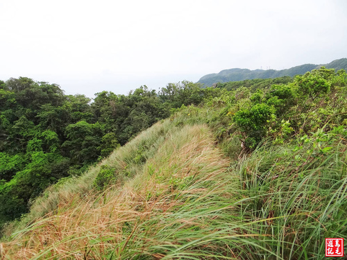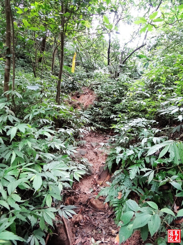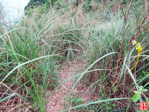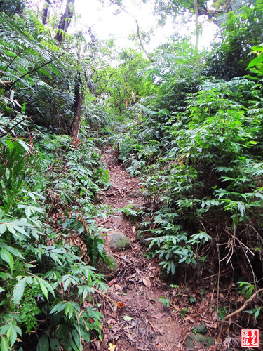 這條路徑從土坡上來沿著山溝溪上爬,兩旁冷青草茂盛,前陣子嘟嘟登山隊、基隆朝陽健行會才走過,路條猶新,路況還不錯,