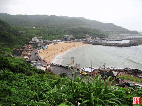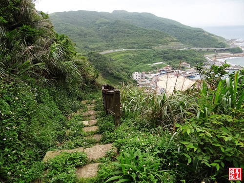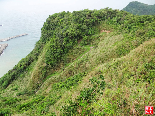 走在稍有雜草的海興步道,沿中山峽谷下往澳仔漁村,風雨之中回望老鷹岩及俯看山下的漁村沙灘景色。