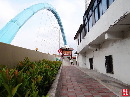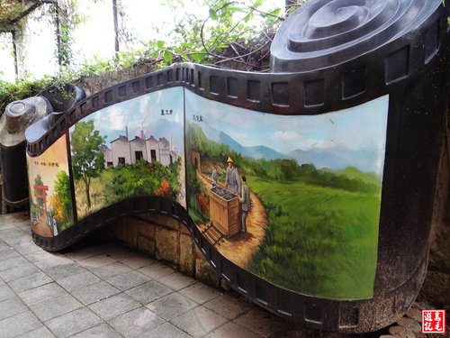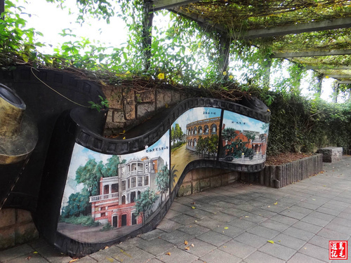 進入綠色廊道,彷彿是走入一條時光隧道,靠河濱側的堤防圍牆出現一幕幕在地的人文歷史場景,且以相片膠卷的造型設計,