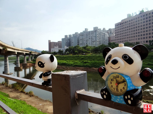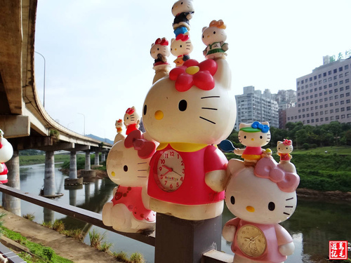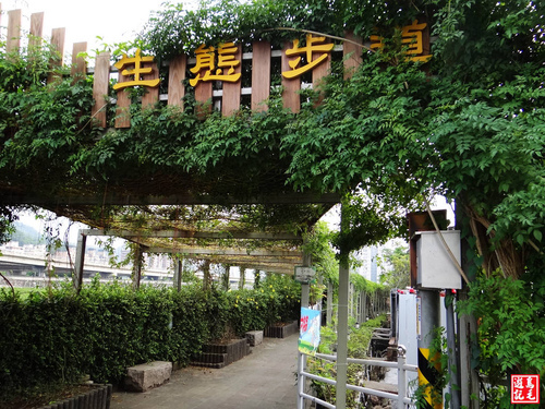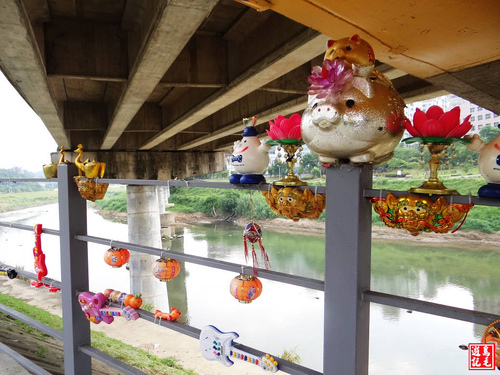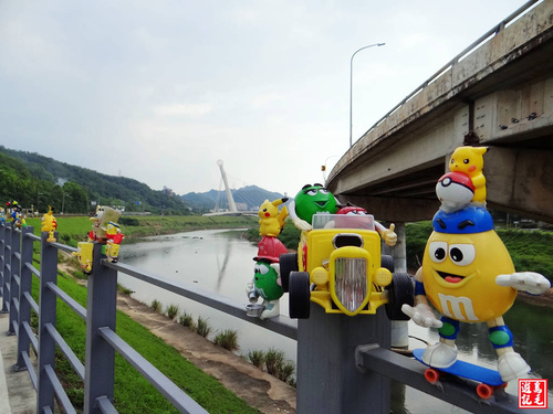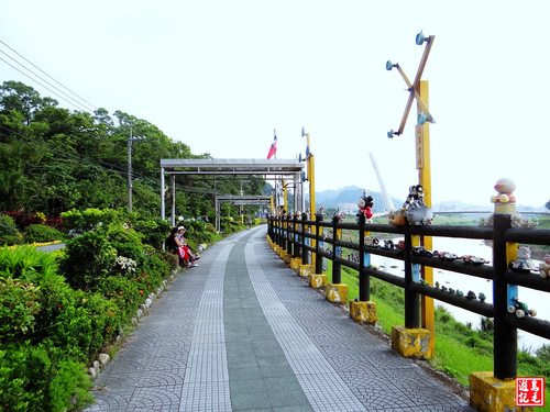 位於江北里這邊的河濱步道,左側以花草樹木與車道作區隔,花木扶疏,賞心悅目,而右側的護欄上則有許多可愛的回收玩偶、玩具,