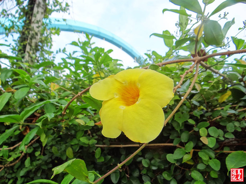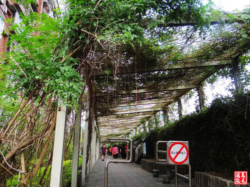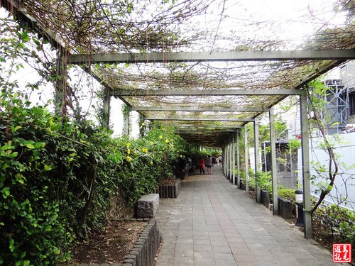 此綠色廊道兩旁栽植軟枝黃蟬、蒜香藤、紫雲藤、錦屏藤、炮仗花及百香果等,這些爬藤類植物日益生長爬滿棚架,同時具有遮蔭與觀賞之功,