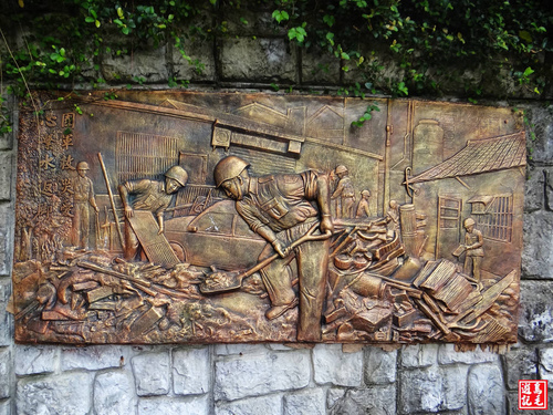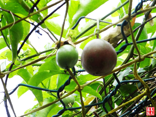 有一幅「國軍救災愛 心繫水返腳」的銅雕立體畫,觀之記憶猶深,於此折返新江北大橋,抬頭一看棚架上的百香果,已有多顆由青綠轉為紫紅色快成熟了。