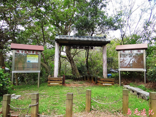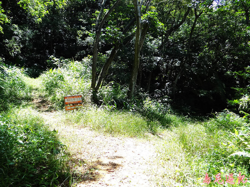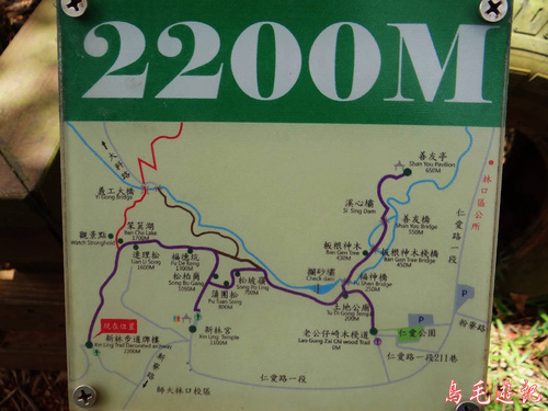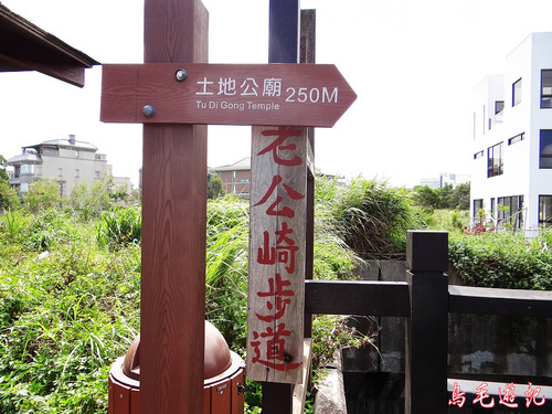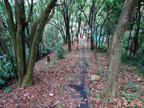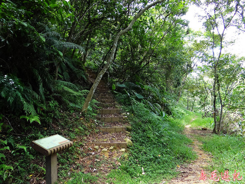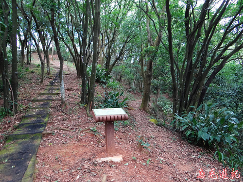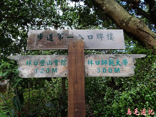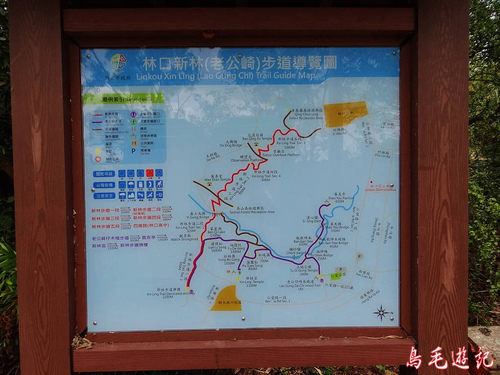 老公崎步道路線在畚箕湖至牌樓路段與新林步道重疊,出登山口後依指標往林口師範大學。