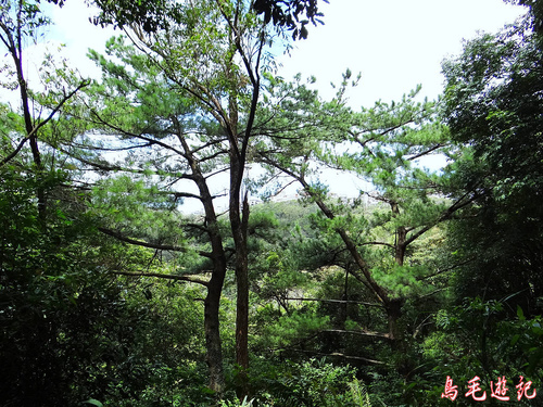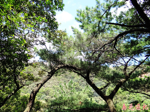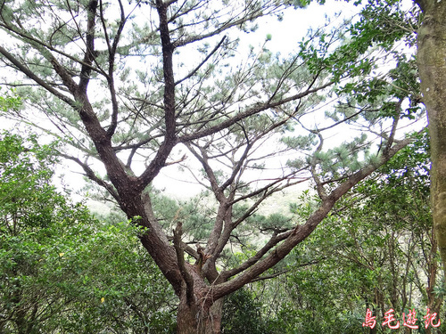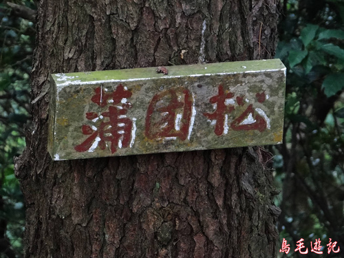 再往上爬有一松樹上釘著「蒲團松」牌子,樹身高約5米,側枝密集在2-3米高度,盤曲於四周,然後平伸,針葉簇集頂部,樹冠鋪展平整,