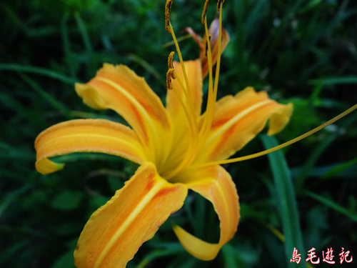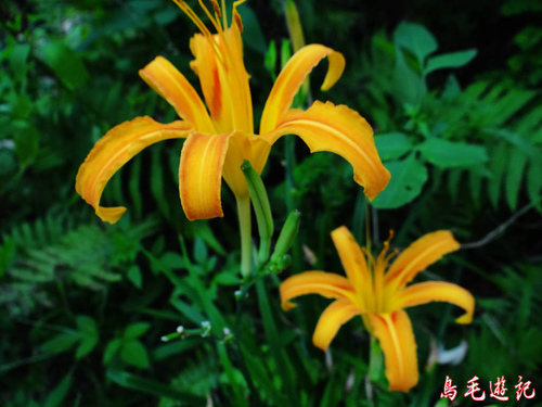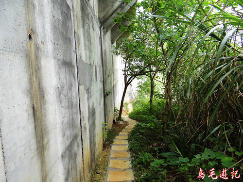 木架階梯上來之後轉為平緩,步道上鋪著回收塊狀地毯從水泥擋牆下通過,路旁散生幾朵金針花。