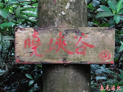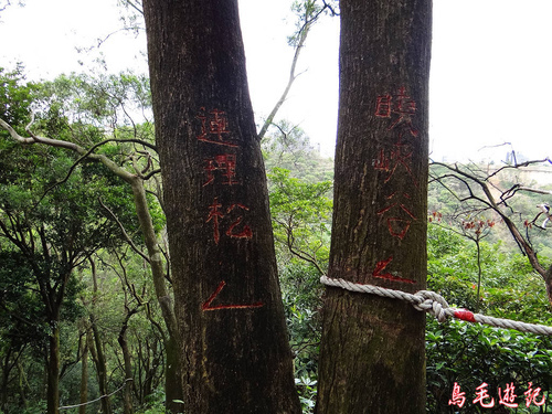 他說此處本來有指標被颱風吹掉不見了,於是他暫在樹幹上刻字「連理松、曉峽谷」並加上箭頭標示。