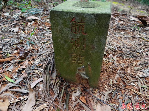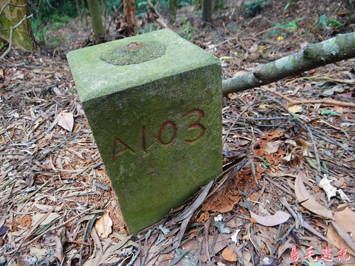主線步道應是往下走,先左上一探究竟,發覺是通往私人民宅,也有產道可下山,途中樹林間發現一座罕見的「航測點A103」基石。