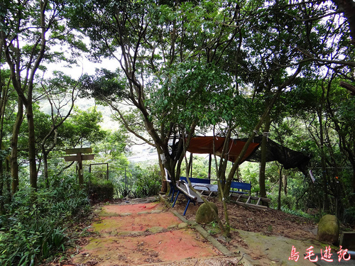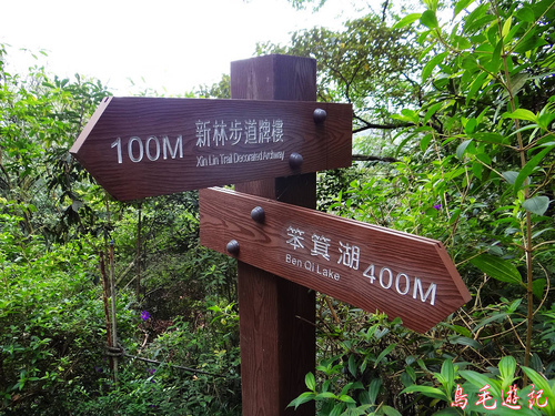 畚箕湖叉路旁有涼亭休息站,行程已近尾聲,在此小歇片刻,續往前走400公尺有叉路,依指標取左往牌樓方向。