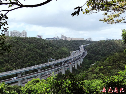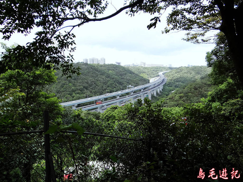 在畚箕湖林間眺望高速公路林口高架橋段,南來北往的車流清楚可見。