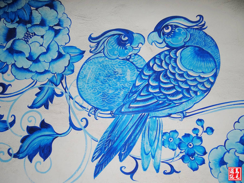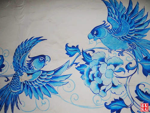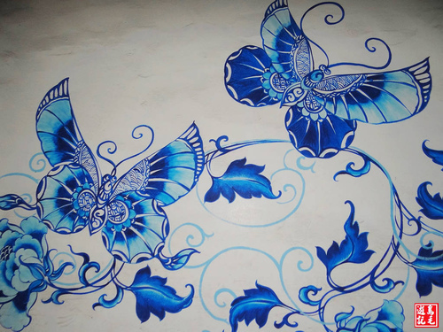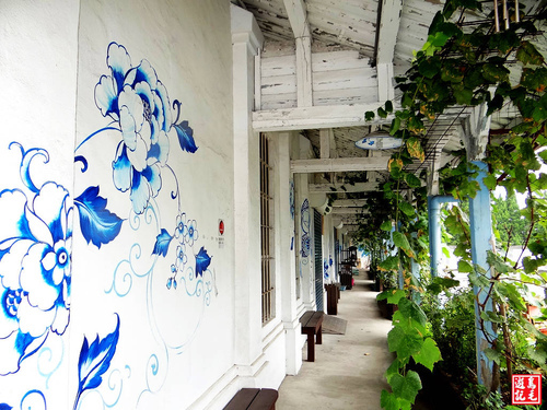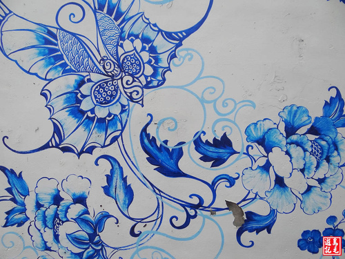 鶯歌車站下車後,從車站對面的文化路181小巷進入,兩旁白色牆壁有楊莉莉青花創作藝術,舉凡蝴蝶、花鳥作品無不精緻。