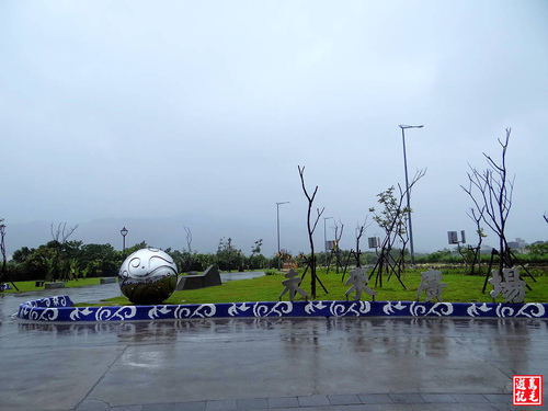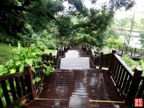 寬大的木棧階梯下來,越過馬路、自行車道的對面就是三鶯陶花源,今天颱風天都沒人,唯有這樣的天氣才能拍到沒人物的自然景觀。