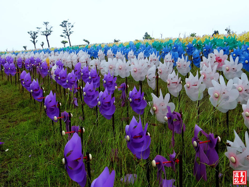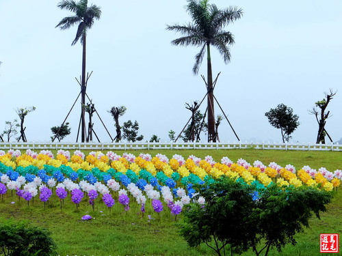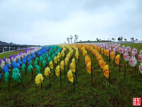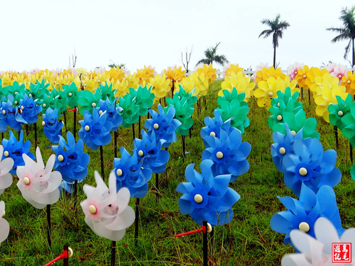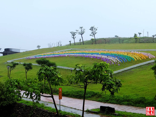 風雨愈來愈大,整個三鶯陶花源園區內空無一人,七彩風車小花海的風車在風雨中轉動的厲害,真希望這美麗的小花海別遭昌鴻颱風無情蹂躪!