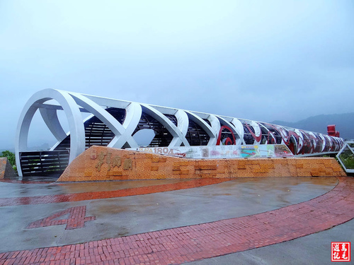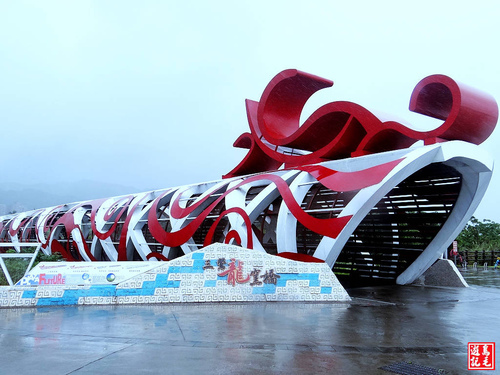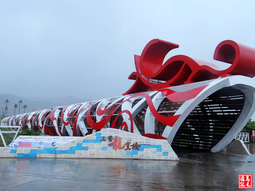龍頭旁解說圖文載:龍窯橋=龍形意象(烤漆鋼板)+木作裝修、不銹鋼編織網+橋樑鋼骨結構,工程費用斥資新台幣六千萬元。