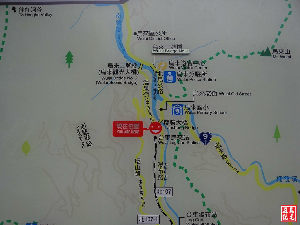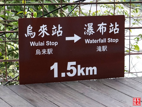 烏來台車站的導覽解說牌、指標,除了中文、英文還有日文,烏來站至瀑布站距離1.5Km。