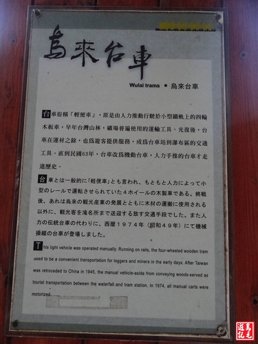 官方解說牌:台車俗稱「輕便車」,原是由人力推動行駛於小型鐵軌上的4輪木板車,早年台灣山林、礦場普遍使用的運輸工具。