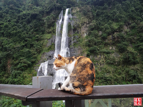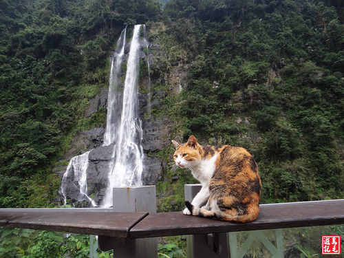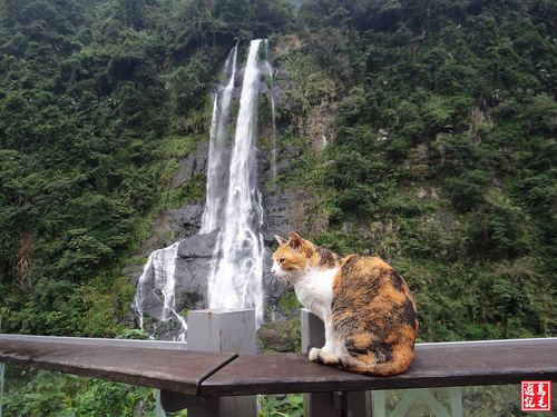 今天早上遊客不多,觀瀑平台的護欄上,有一隻貴婦貓正在賞瀑,見她個性溫馴,擺出自然的Pose,