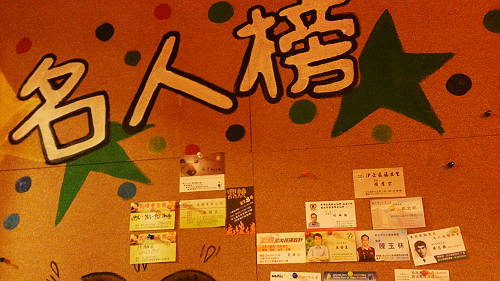 店老闆黑狗兄喜歡交朋友,在牆壁上推出「名人榜」,如果客人願意可自行將名片貼上,因為這裡也是聊天喝酒的所在,