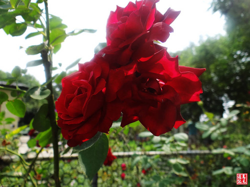 紅色噴泉玫瑰原產地是美國,劍瓣高心型,中輪一莖多花黑紅色強香,四季開花,需栽種陽光較強地方。