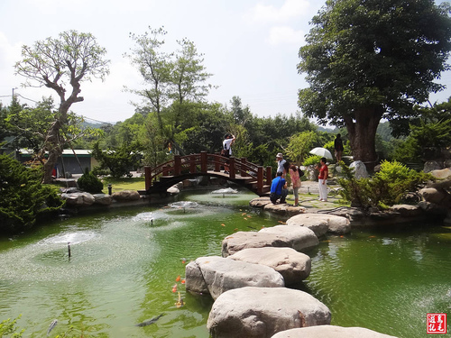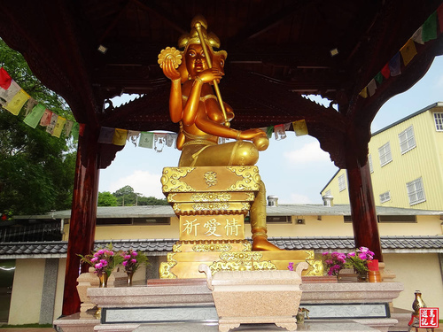 從日式京都風格的牌樓山門進入後,眼前即是「諸天殿」,主供彌勒佛菩薩及二十四諸天神,殿旁有山水拱橋魚池景觀。