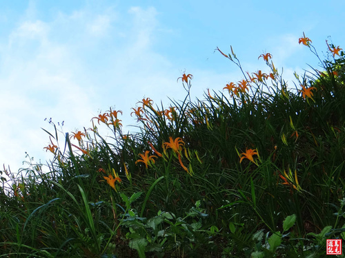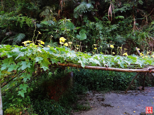 此處有一間農舍,棚架上的絲瓜黃花朵朵,我與Fuli兄弟二人在此稍作休息,農舍前山坡一小片的金針花海,也是此行小確幸。