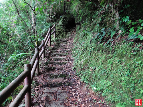 最後這一段一路陡上枕木階梯,抵獅子嘴奇岩叉路鞍部平台,直行主線陡下,部分路段因雨水沖刷路基流失,較坎坷難行。