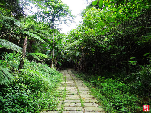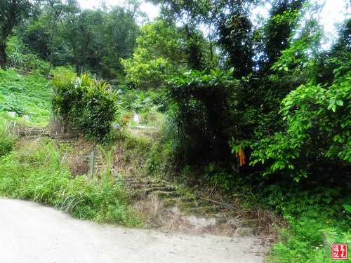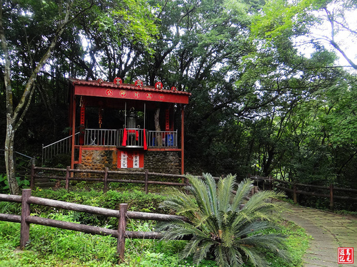中坑古道林相原始而清幽,經過木板橋越溪,於4.0K處枕木階再緩上,經第2處碎石平台之後,路旁有一極為古老的石造土地公廟,
