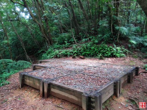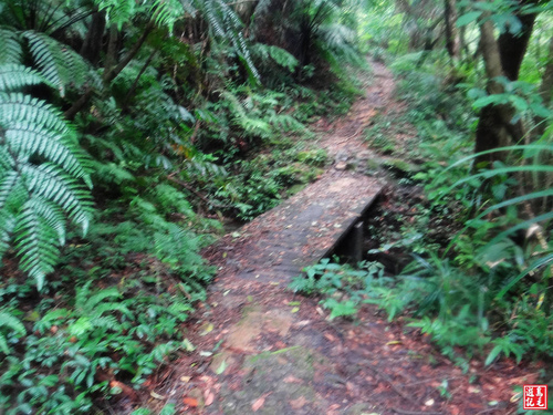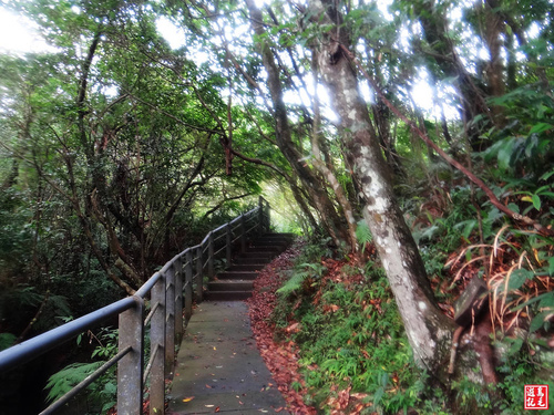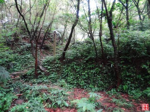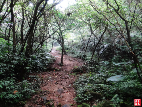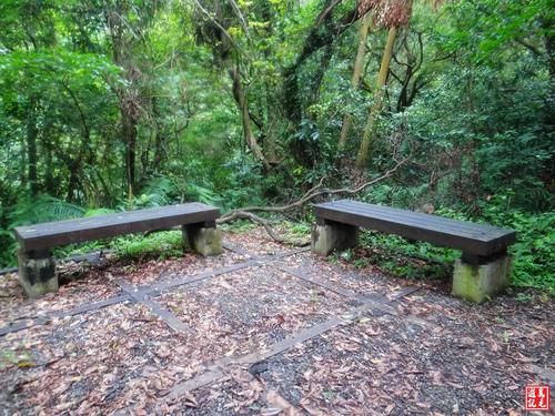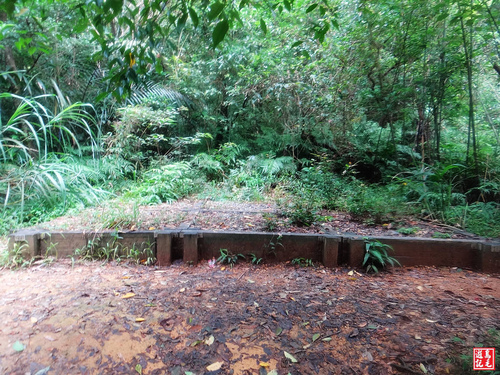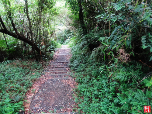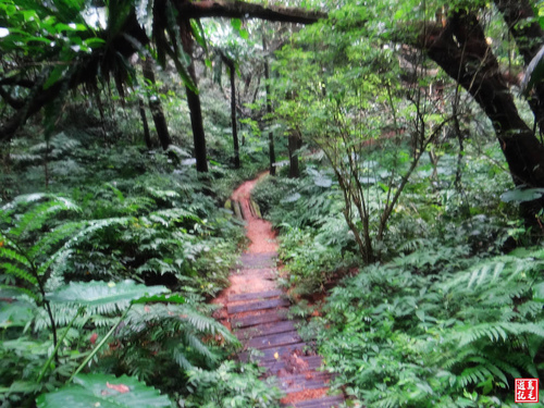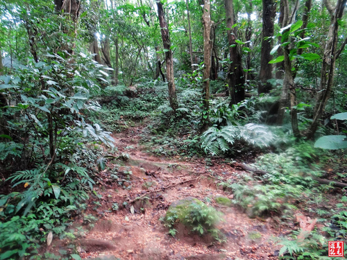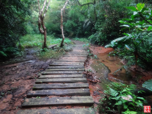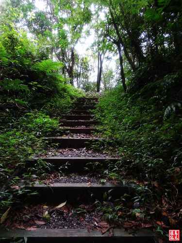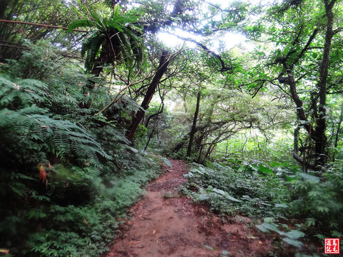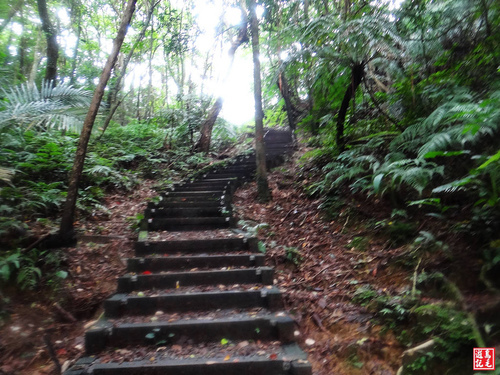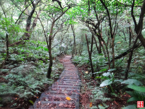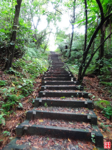 緊接著步道或泥土路或枕木階,爬上爬下幾回合,汗水狂流,途中鞍部處有碎石平台,短暫停留擦汗休息喝水一下。