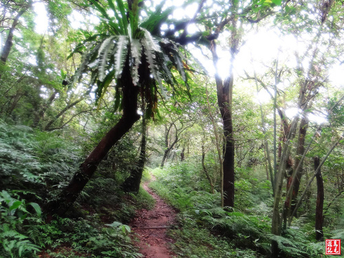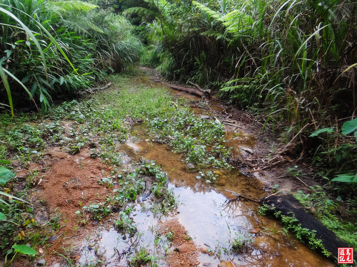 稍後,林蔭下續走,經過小溪旁有拓墾區,步道從芒草區內沼澤溼地通過,須注意踏點,以免陷入泥沼之中。