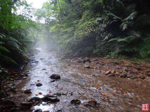 此後冷清草土路小徑下切至溪流處,今日水勢不大,溪寬但水淺,便以蜻蜓點水之姿,縱身輕躍到達對岸。