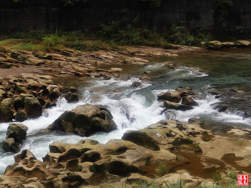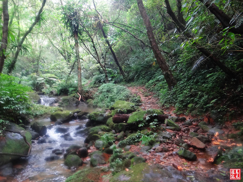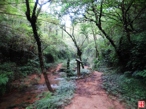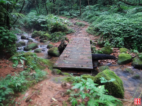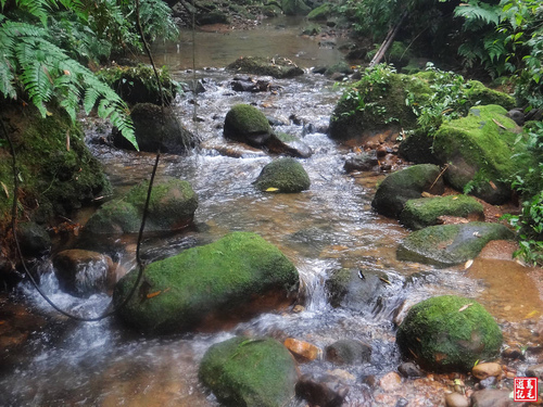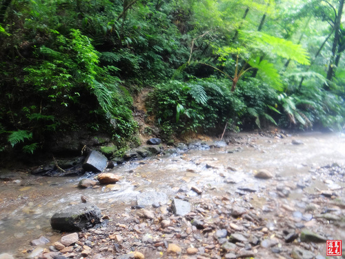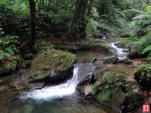 接下來轉為平緩土石路,古道時而在溪左時而在溪右,溪水清澈,水聲潺潺,清溪綠石間小瀑無數,置身其間,暑氣全消,為古道菁華路段。