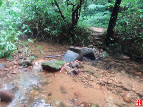 枕木階碎石路一路下切,經過中坑聚落遺址之後,又再沿溪而行,橫越一處小溪,水泥塊多已傾斜,小心通過。