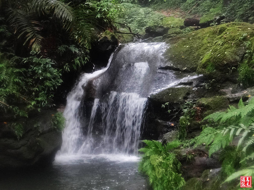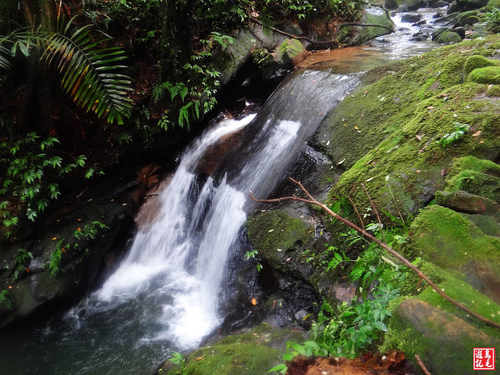 見一小瀑布,瀑底一池青潭,自肩上卸下背包、相機,趨近嬉水沖涼一番,加上山中涼風吹來,如同天然的冷氣,怎一個爽字可比擬。