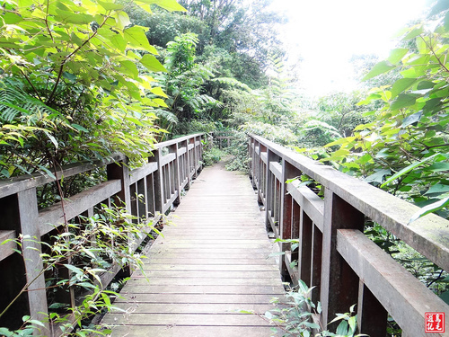 從福興宮旁階梯上來之後,步道行走於林蔭之下,沿溪而行,起伏不大,通過溼地路段鋪設有枕木。