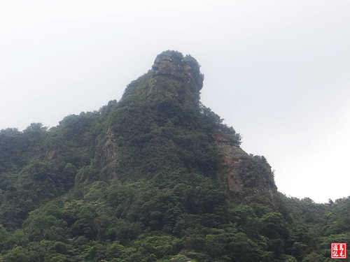 柴寮古道過木棧橋後轉為寬大的土石產道,仰望右上方突起的山頭巨岩,即獅子嘴奇岩,破損水泥產道一路下坡,下山腳步輕快,行程已接近尾聲。