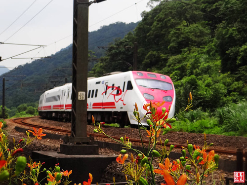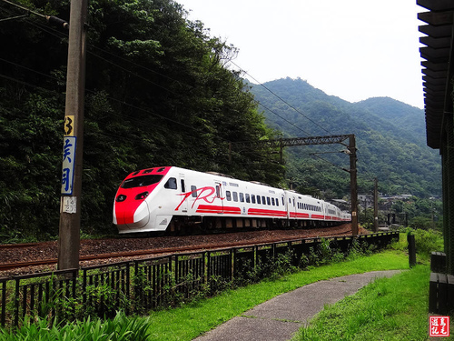 往猴硐車站方向幾步階梯上來有休息平台,此處可觀賞基隆河奇特的壺穴岩床,且位於北迴鐵路彎道處,一列普悠瑪自強號列車疾駛而過,倏地消失眼前。