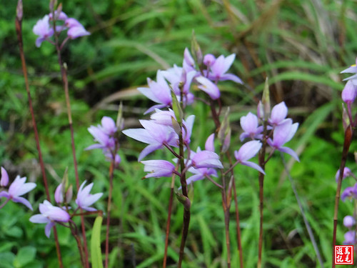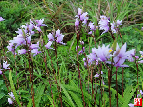 接下來解說人員就帶著大夥兒去走龜山島軍事坑道,從南岸碼頭旁階梯往「島孤人不孤」立碑上走,駁坎上方有許多粉紫色的野生蘭花。