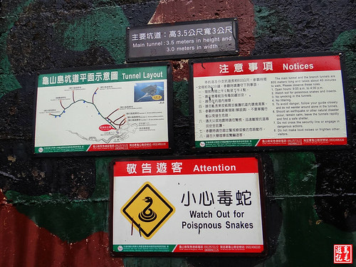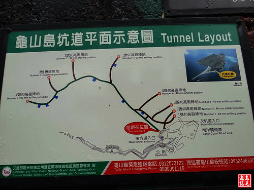 龜山島軍事坑道入口位於「島孤人不孤」立碑後面,面向崗哨右邊的後方,入口處設有坑道平面示意圖,主要坑道高3.5公尺、寬3公尺。