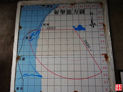 從坑口至1號90高砲陣地步行約5分鐘,此處仍留存一座廢棄的90高砲,而看到「射擊能力範圍圖」從這個方向打出去的砲彈,目標卻是頭城、礁溪、宜蘭的外海一帶。