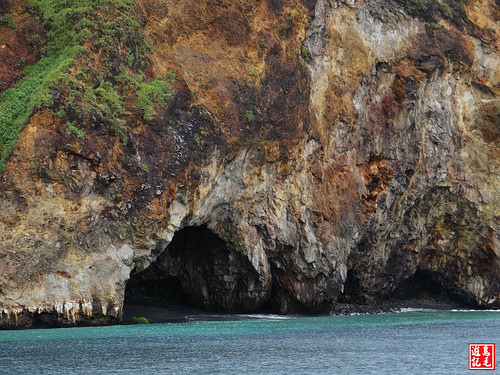 在峭壁與海面交接處,因受海水的侵蝕而形成半圓形的山洞為海蝕洞 ,從海上眺望形似「眼鏡洞」而名為龜山八景之一。