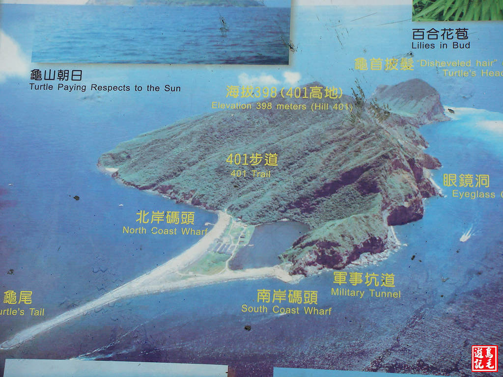 今天採逆時針方向繞島,從南岸碼頭出發,依序會看到砲陣地機槍口、眼鏡洞、海底溫泉、401高地、龜首批髮等奇妙景致。