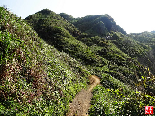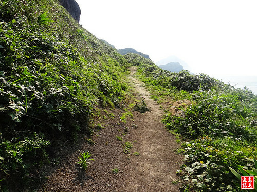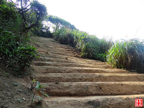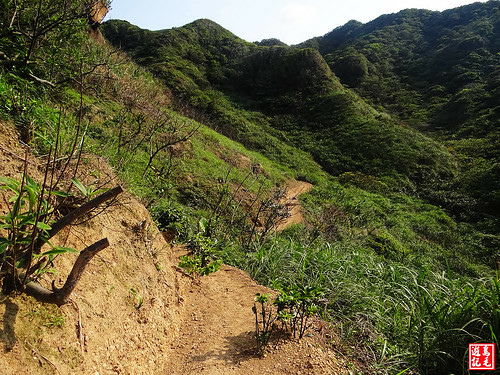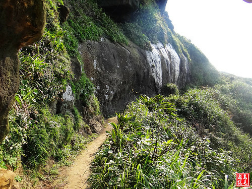 步道續通過一段陡峭石壁下,然後是寬大的土路緩上,瞧這路況整理的未免太功夫了吧,連邊坡上也是乾乾淨淨的呢。
