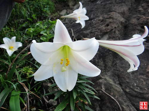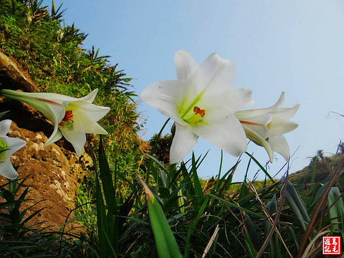 已經下午3點多了,陽光變得柔和許多,開車行駛台2線經過鼻頭社區時,望見山谷岩壁之間,幾朵皎潔的野百合花盛開,迎風搖曳,