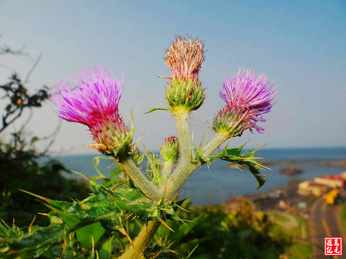 原路返回鼻頭社區停車場,踏著輕鬆愉快的步伐,夕陽無限好,只是近黃昏,回眸一瞥,山坡間盛開的的粉紫色薊花、潔白的野百合,似與我揮手道珍重。