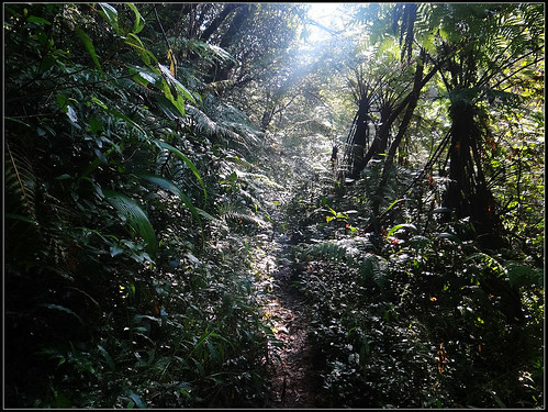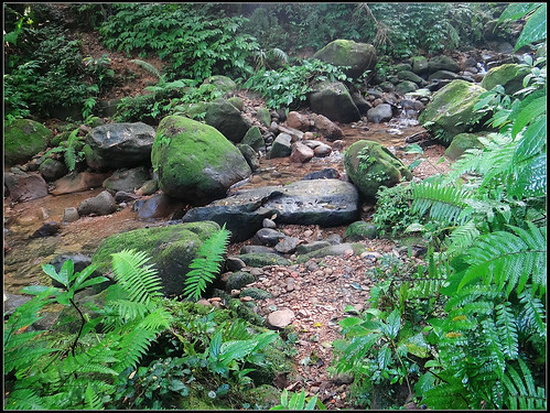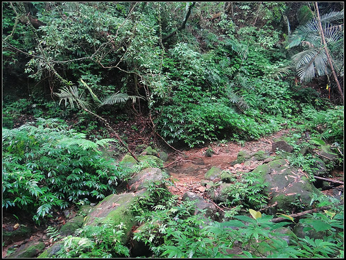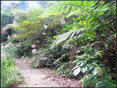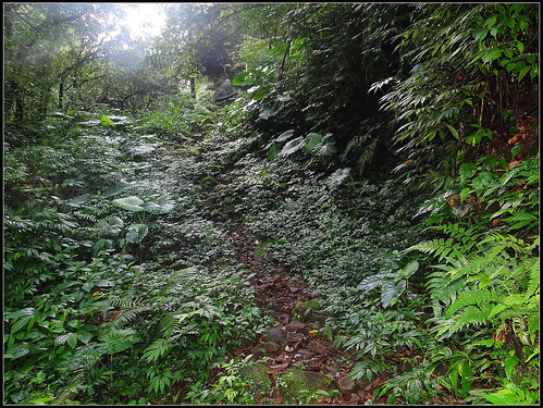 進入步道之後沿著小溪旁緩緩上爬,原始小徑兩旁都是茂密的冷清草、蕨類植物,感覺真是一條名符其實的古道呀。