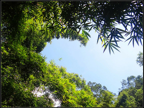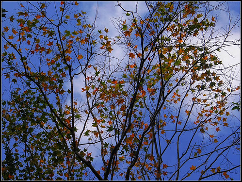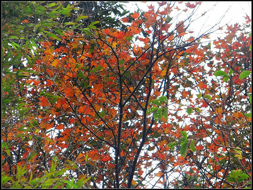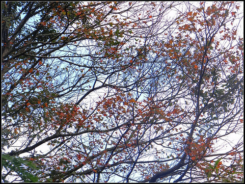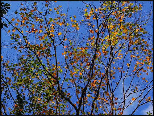 望著藍天下的楓葉由綠轉黃又泛紅,有的還在半黃半紅之間,一閃一閃亮晶晶,藍天下閃耀著滿天星,讓人看了很高興。
