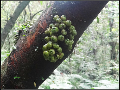 接下來,步道路線或平緩或稍有起伏,路徑不甚清晰但仍不難通行,沿途有許多水同木植物分布,樹幹上長出一粒粒樹果。