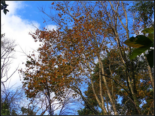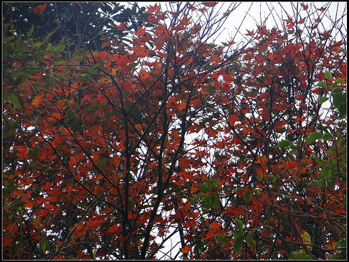 山上的楓葉已泛紅,迎風婆娑沙沙作響,僅一、二棵紅楓,幾點殘紅,也為此行增添了一些美感。